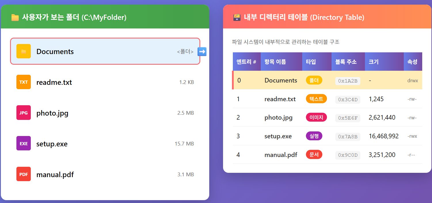 - 한 행 = 디렉터리 엔트리 (Directory Entry)